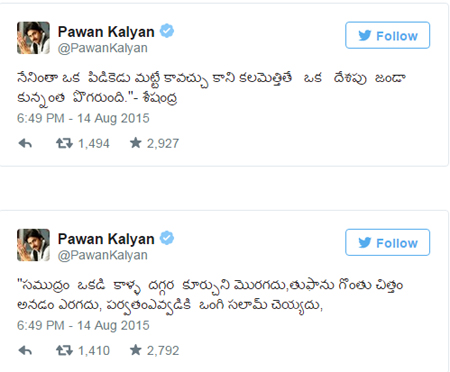 "సముద్రం  ఒకడి  కాళ్ళ  దగ్గర  కూర్చుని మొరగదు, తుఫాను గొంతు చిత్తం అనడం ఎరగదు, పర్వతంఎవ్వడికి  ఒంగి సలామ్ చెయ్యదు.. నేనింతా ఒక  పిడికెడు మట్టే కావచ్చు కాని కలమెత్తితే ఒక దేశపు జండా కున్నంత  పొగరుంది అంటూ ప్రముఖ కవి గుంటూరు శేషేంద్ర శర్మ కావ్యాన్ని గుర్తుచేస్తూ ట్వీట్స్ పోస్టు చేశారు. కవి శేషేంద్ర శర్మ ఎలాగైతే చెప్పారో అలాంటి భావనే ప్రతిఒక్కరి మనసులో ఉండాలని అన్నారు.