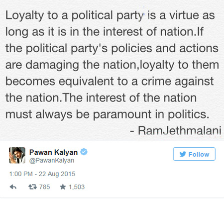 "ఒక పార్టీ దేశ ప్రయోజనాల కోసం పనిచేస్తున్నప్పుడు ఆ పార్టీకి విధేయత చూపడంలో అర్థం ఉంటుంది.. అంతేకాని పార్టీ విధి విధానాలు దేశ ప్రయాజనాలను దెబ్బతీసేలా ఉన్నప్పుడు అది నేరానికి పాల్పడడంతో సమానమని, రాజకీయాలకు దేశ ప్రయోజనాలే ప్రథమ ప్రాధాన్యం కావాలని రాంజెఠ్మలానీ చేసిన వ్యాఖ్యలను ఆయన ట్వీట్ చేశారు."