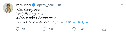 పవన్ కల్యాణ్ ట్వీట్కు మంత్రి పేర్ని నాని సైతం అదే స్థాయిలో బదులిచ్చారు. ‘‘జనం ఛీత్కారాలు, ఓటర్ల తిరస్కారాలు, తమరి వైవాహిక సంస్కారాలు, వరాహ సమానులకు న‘మస్కా’రాలు’’ అంటూ ట్వీట్ చేసి రచ్చ మరింత రాజేశారు. పవన్ కల్యాణ్పై ఓ ట్రోల్ వీడియోనూ సైతం పోస్ట్ చేశారు పేర్ని నాని.