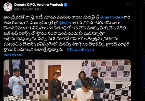 అలా ఎదగాలని మనస్ఫూర్తిగా కోరుకుంటున్నానని పేర్కొన్నారు. దేవాన్ష్ కేవలం 11 నిమిషాల 59 సెకండ్లలోనే 175 చెస్ పజిల్స్ పూర్తి చేసి వరల్డ్ బుక్ ఆఫ్ రికార్డ్స్లో స్థానం దక్కించుకున్న సంగతి తెలిసిందే. అందుకు దేవాన్ష్ ను అభినందించిన పవన్ కల్యాణ్ దేవాన్ష్ సాధించిన ఘనతకు సంబంధించిన వీడియోను కూడా ఆ పోస్టుకు జత చేశారు.