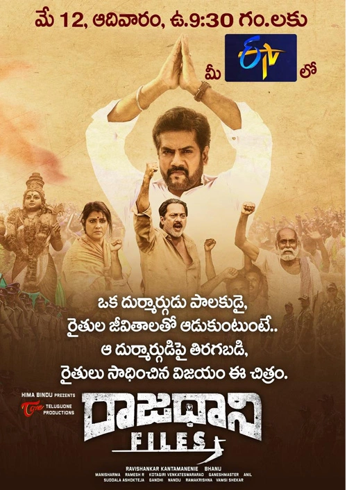 అమరావతి రైతుల ఆవేదనకు అద్దం పట్టేలా శ్రీమతి హిమబిందు సమర్పణలో, భాను దర్శకత్వంలో తెలుగువన్ ప్రొడక్షన్స్ పతాకంపై రవిశంకర్ కంఠంనేని నిర్మించిన ‘రాజధాని ఫైల్స్’ చిత్రం ఈనెల 12 ఆదివారం నాడు ఉదయం 9 గంటల 30 నిమిషాలకు ఈటీవీలో ప్రసారం కాబోతోంది. ఒక దుర్మార్గుడు పాలకుడై రైతుల జీవితాలతో ఆడుకుంటుంటే, ఆ దుర్మార్గుడిపై తిరగబడి, రైతులు సాధించిన విజయం ఈ చిత్రం.