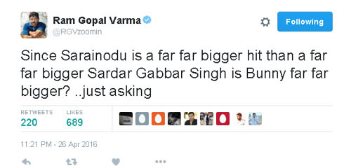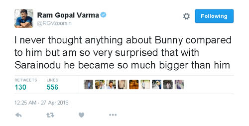 అల్లుఅర్జున్, బోయపాటి కాంబినేషన్లో వచ్చిన సరైనోడు సినిమా గురించి వర్మ మాట్లాడుతూ తను ఇచ్చిన మాటను తప్పాడు.. పవర్స్టార్ పవన్ కళ్యాణ్, స్టైలిష్ స్టార్ అర్జున్లను పోల్చుతూ.."ఈ ఇద్దరు మెగా స్టార్ హీరోలలో ఎవరు ఎక్కువ?" అని ప్రశ్నిస్తూ, తన దైన శైలిలో క్లారిటీని ఇచ్చారు. 'సర్ధార్ గబ్బర్ సింగ్' సినిమా కంటే, అల్లు అర్జున్ నటించిన 'సరైనోడు' పెద్ద హిట్ని దక్కించుకుందని అందుచేత 'పవన్ కళ్యాణ్ కంటే అల్లూ అర్జున్ ఎక్కువ?' అంటూ ట్విట్టర్లో వర్మ తెలిపారు.