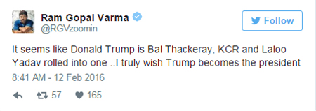 వివాదాస్పద వ్యాఖ్యలకి కేర్ ఆఫ్ అడ్రస్ ఎవరంటే టక్కున గుర్తొచ్చే పేరు రామ్ గోపాల్ వర్మ. ఎవరిమీదైనా సరే నిర్మొహమాటంగా..తనకి ఏం మాట్లాడాలనిపిస్తే అది మాట్లాడేస్తాడు. అయితే ఇప్పటి వరకూ జాతీయ స్థాయిలోనే విమర్శలు చేసిన రాంగోపాల్ వర్మ.. ఇప్పుడు తాజాగా అమెరికా అధ్యక్ష బరిలో ఉన్న డోనాల్డ్ ట్రంప్ను కూడా వదల్లేదు. ప్రస్తుతం డోనాల్డ్ ట్రంప్ రిపబ్లికన్ పార్టీ తరఫున అమెరికా అధ్యక్ష బరిలో ఉన్నారు. ఈయన వ్యవహార శైలిపై రాంగోపాల్ వర్మ స్పందిస్తూ.. అమెరికా చరిత్రలోనే ఇంత కలర్ఫుల్ అధ్యక్ష అభ్యర్థి, బహిరంగంగా మాట్లాడే వ్యక్తి మరొకరు ఉన్నారని తాను అనుకోవడం లేదని.. బాల్ థాకరే, కేసీఆర్, లాలూ ప్రసాద్ యాదవ్లు ముగ్గురు ఒకే వ్యక్తిగా మారితే.. అతనే డొనాల్డ్ ట్రంప్ అని, డొనాల్డ్ అమెరికా అధ్యక్షుడు కావాలని మనస్పూర్తిగా కోరుకుంటున్నానంటూ వర్మ ట్విట్టర్లో తన సందేశాన్ని పోస్టు చేశారు. మొత్తానికి రామ్ గోపాల్ వర్మ అమెరికా వాళ్లను కూడా వదలట్లేదు.