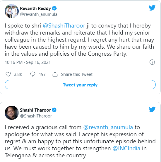 పార్లమెంటరీ ఐటీ స్థాయీ సంఘం ఛైర్మన్ హోదాలో కాంగ్రెస్ నేత శశిథరూర్ ఈ మధ్య హైదరాబాద్కు వచ్చారు. తెలంగాణ ప్రభుత్వాన్ని అభినందించారు. దానిపై రేవంత్రెడ్డి.. శశిథరూర్ను అడ్డగాడిద అంటూ విమర్శించారు. ఓ మీడియా ప్రతినిధితో చిట్ చాట్గా మాట్లాడుతూ రేవంత్రెడ్డి ఇలా గాడిద అంటూ మాట్లాడారు. ఆ ఆడియో వైరల్ కావడంతో.. అది కాస్తా శశిథరూర్ వరకూ చేరింది. దీంతో.. శశిథరూర్ నుంచి కూడా కౌంటర్ పడింది. రేవంత్ మూలాలు అక్కడే ఉన్నాయి కాబట్టి అలా అన్నారంటూ రిప్లై ఇచ్చారు. ఈ క్రమంలో చివరకు రేవంత్ రెడ్డి శశిథరూర్కు ట్విటర్ వేదికగా క్షమాపణ చెప్పారు. దీనిపై సానుకూలంగా స్పందించిన థరూర్.. ఈ వివాదానికి ముగింపు పలుకుదామన్నారు. ‘మనం అంతా కలిసి దేశంలో, రాష్ట్రంలో కాంగ్రెస్ను బలోపేతం చేద్దామని రీట్వీట్ చేశారు.