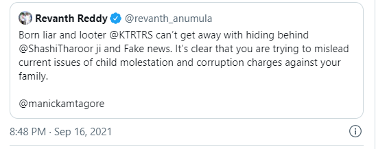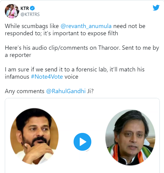 రేవంత్రెడ్డి, శశిథరూర్ ఎపిసోడ్లో మధ్యలో కేటీఆర్ ఎంట్రీ అయ్యారు. రేవంత్ ఆడియోను పోస్ట్ చేస్తూ.. సహచర ఎంపీ రేవంత్ రెడ్డి.. శశిథరూర్పై అవమానకరంగా ఇలా కామెంట్స్ చేయడం దారుణమని మంత్రి కేటీఆర్ ట్విటర్లో పోస్ట్ పెట్టారు. నేర చరిత్ర, స్వభావం ఉన్న వారు పార్టీకి నాయకత్వం వహిస్తే ఇలాగే ఉంటుందన్నారు. థరూర్పై రేవంత్ చేసిన వ్యాఖ్యలకు సంబంధించిన ఆడియోను ట్విటర్లో ఉంచుతూ.. దీన్ని ఫోరెన్సిక్ విభానికి పంపిస్తే ఓటుకు నోటు కేసులో ఉన్న రేవంత్ గొంతుతో కచ్చితంగా సరిపోతుందంటూ మరింత మంట రాజేశారు కేటీఆర్. తన ట్వీట్ను రాహుల్గాంధీకి సైతం ట్యాగ్ చేశారు.