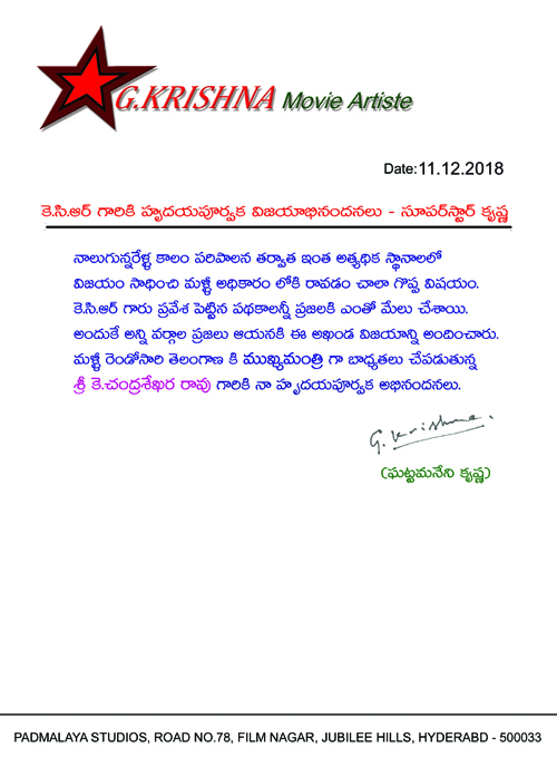 టాలీవుడ్ సూపర్ స్టార్ కృష్ణ కేసీఆర్ గారికి హృదయ పూర్వక విజయాభినందనలు అంటూ ఓ ప్రకటన కూడా విడుదల చేశారు. నాలుగున్నరేళ్ల పాటు పరిపాలన తర్వాత ఇంత అత్యధిక స్థానాలలో విజయం సాధించి మళ్లీ అధికారంలోకి రావటం చాలా గొప్ప విషయం. కేసీఆర్ గారు ప్రవేశ పెట్టిన పథకాలన్నీ ప్రజలకి ఎంతో మేలు చేశాయి. అందుకే అన్ని వర్గాల ప్రజలు ఆయనకి ఈ అఖండ విజయాన్ని అందించారు. మళ్లీ రెండో సారి తెలంగాణకి ముఖ్యమంత్రిగా బాధ్యతలు చేపడుతున్న శ్రీ చంద్రశేఖర్ రావుగారికి నా హృదయ పూర్వక అభినందనలు`` అంటూ ఓ లేఖను విడుదల చేశారు.