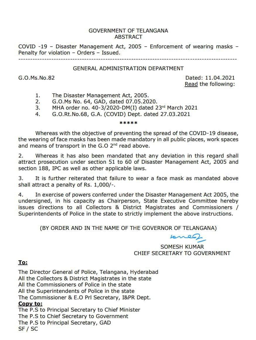 తెలంగాణలోవేల సంఖ్యలో కొవిడ్ పాజిటివ్ కేసులు నమోదవుతున్న నేపథ్యంలో రాష్ట్ర ప్రభుత్వం కఠినచర్యలు తీసుకుంటోంది. ఇకపై మాస్కు ధరించకపోతే రూ.1000 జరిమానాగా వడ్డిస్తారు. డిజాస్టర్ మేనేజ్ మెంట్ యాక్ట్-2005, కేంద్రం మార్గదర్శకాలకు అనుగుణంగా ఈ నిర్ణయం తీసుకున్నారు. ఈ మేరకు సర్కారు అధికారిక ఉత్తర్వులు జారీ చేసింది.బహిరంగ ప్రదేశాల్లోనూ, ప్రయాణాల్లోనూ, పనిచేసే ప్రదేశాల్లోనూ మాస్కు తప్పనిసరి అని సీఎస్ సోమేశ్ కుమార్ ఉత్తర్వుల్లో స్పష్టం చేశారు. తాజా ఉత్తర్వులను కఠినంగా అమలు చేయాలంటూ జిల్లా కలెక్టర్లు, ఉన్నతాధికారులను ఆదేశించారు.