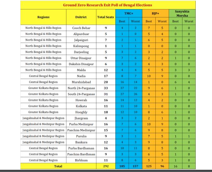 కుచ్ బీహార్ , అలిపూర్దూర్..జల్ పాయ్ గురి, డార్జిలింగ్ . దక్షిణ్ దినాజ్ పూర్ , మాల్దా, నదియా జిల్లాలో బీజేపీకి లీడ్ కనిపిస్తోంది. హుగ్లి, మిడ్నాపూర్, పూరిలియా, బంకూరా జిల్లాలో హోరాహోరీ పోరు సాగినా.. కమలానికి ఆధిక్యత కనిపిస్తోంది. కోల్ కతాలో మాత్రం టీఎంసీ స్వీప్ చేసేలా పరిస్థితులు కనిపిస్తున్నాయి. హౌరా జిల్లాలోనూ టీఎంసీ హవా ఉందని గ్రౌండ్ జీరో రీసెర్చ్ ఎగ్జిట్ పోల్ సర్వే వెల్లడిస్తోంది.