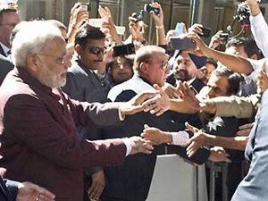 భారత ప్రధాని శుక్రవారం రాత్రి అమెరికా చేరుకున్నారు. దాదాపు రెండున్నర దశాబ్దాల తర్వాత అమెరికాలో పాదం మోపిన మోడీకి న్యూయార్క్లో ఘన స్వాగతం లభించింది. మోడీ విమానంలోంచి దిగగానే స్థానిక భారతీయులు ‘మోడీ.. మోడీ’ అని నినాదాలు చేస్తూ స్వాగతం పలికారు. మోడీ బసచేసిన హోటల్ బయట ఆయనకు స్వాగతం పలికి, అభినందనలు తెలిపేందుకు అభిమానులు పోటీ పడ్డారు. మోడీ కూడా భద్రతా నియమాలను పక్కన పెట్టి అక్కడకి వచ్చిన వారిలో కలసిపోయి పలకరించారు. సాధారణంగా అమెరికాలో రాజకీయ నాయకుల దగ్గరకి జనం వెళ్ళిపోవడం అరుదుగా జరుగుతూ వుంటుంది. అమెరికా పర్యటనకు వచ్చే నాయకుల భద్రత విషయంలో అమెరికాలో అధికారులు చాలా జాగ్రత్తగా వ్యవహరిస్తూ వుంటారు. ఏ దేశ ప్రధానికీ లభించనంత ఘన స్వాగతం మోడీకి లభించింది. దీనికోసం భద్రతా నిబంధనలను కూడా కొంచెం సడలించారు.