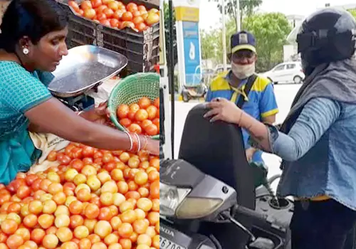 మూడు లీటర్ల పెట్రోల్ కు కిలో టమోట.. తగ్గేదేలే..