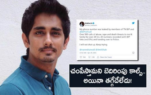 తమిళనాడులో అసెంబ్లీ ఎన్నికల పోలింగ్ ముగిసినా.. రాజకీయ కాక మాత్రం ఆగడం లేదు. తనను బీజేపీ నేతలు టార్గెట్ చేస్తున్నారని ప్రముఖ నటుడు సిద్దార్థ్ ఆరోపించడం కలకలం రేపుతోంది. తమిళనాడుకు చెందిన బీజేపీ నేతలు తన ఫోన్ నంబర్ని సోషల్ మీడియాలో లీక్ చేశారని సిద్ధార్థ్ ట్వీట్ చేశారు. తనని, తన కుటుంబాన్ని చంపేస్తామంటూ పలువురు బెదిరిస్తున్నారని ఆరోపించారు. తన ట్వీట్ ను ప్రధాని నరేంద్ర మోడీ, కేంద్ర హోంశాఖ మంత్రి అమిత్ షాకు ట్యాగ్ చేశారు సిద్ధార్థ్. ‘తమిళనాడు భాజపాకు చెందిన కొంతమంది నా ఫోన్ నంబర్ని లీక్ చేశారు. సుమారు 500 ఫోన్కాల్స్.. అందరూ నన్ను తిడుతున్నారు. నా కుటుంబసభ్యులను అత్యాచారం, హత్య చేస్తామంటూ గడిచిన 24 గంటల నుంచి నన్ను హెచ్చరిస్తున్నారు. ఆ ఫోన్ నంబర్లు, వాళ్లు మాట్లాడిన రికార్డింగ్స్ అన్నింటినీ భద్రపరిచా. వాటిని పోలీసులకు అందిస్తున్నా’ అని సిద్దార్థ్ ట్వీట్ లో తెలిపారు. టాలీవుడ్, కోలీవుడ్లలో ఎన్నో చిత్రాల్లో నటించి పేరు తెచ్చుకున్న సిద్దార్థ్ గత కొన్నిరోజులుగా కేంద్రంలో ఉన్న బీజేపీ ప్రభుత్వంపై విమర్శలు చేస్తూ సోషల్మీడియా వేదికగా పోస్టులు పెడుతున్నారు. తమిళనాడు అసెంబ్లీ ఎన్నికల్లోనూ ఆయన బీజేపీ కూటమికి వ్యతిరేకంగా ఉన్నారు. ఈ క్రమంలోనే పలువురు బీజేపీ కార్యకర్తలతో ఆయనకు ఆన్లైన్లో మాటల యుద్ధం జరుగుతోంది. తాజాగా తనను ఫోన్ లో కొందరు బెదిరిస్తున్నారని,చంపేస్తామని వార్నింగ్ ఇస్తున్నారని సిద్ధార్థ్ ఆరోపించడంతో వివాదం మరింత ముదిరింది. మరోవైపు తమిళనాడు అసెంబ్లీ ఎన్నికల కౌంటింగ్ మే2న జరగనుంది. తమిళనాడు ఎన్నికలకు సంబంధించి వెలువడిన అన్ని ఎగ్జిట్ పోల్స్ సర్వేల్లోనూ డీఎంకే కూటమిదే విజయమని తేలింది. బంపర్ మెజార్టీతో స్టాలిన్ గెలవబోతున్నారని వెల్లడించాయి. ఈ నేపథ్యంలోనే బీజేపీ టార్గెట్ గా సిద్ధార్థ్ తన వాయిస్ పెంచారనే చర్చ జరుగుతోంది. తనకు వచ్చిన బెదిరింపు కాల్స్ పై కొత్త సర్కార్ వచ్చాకా ఆయన ఫిర్యాదు చేసే అవకాశం ఉందని భావిస్తున్నారు.