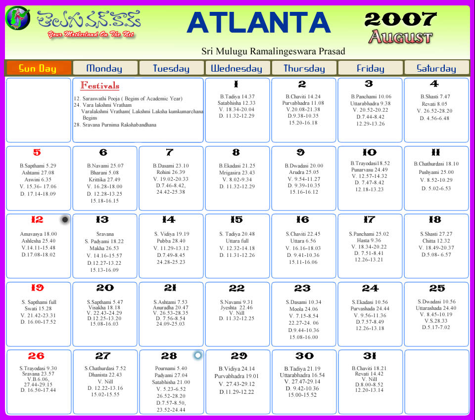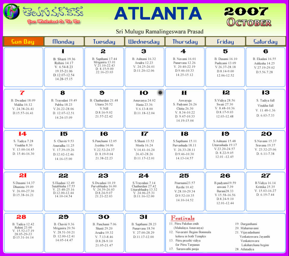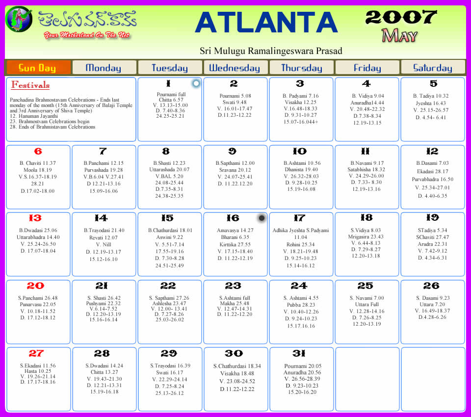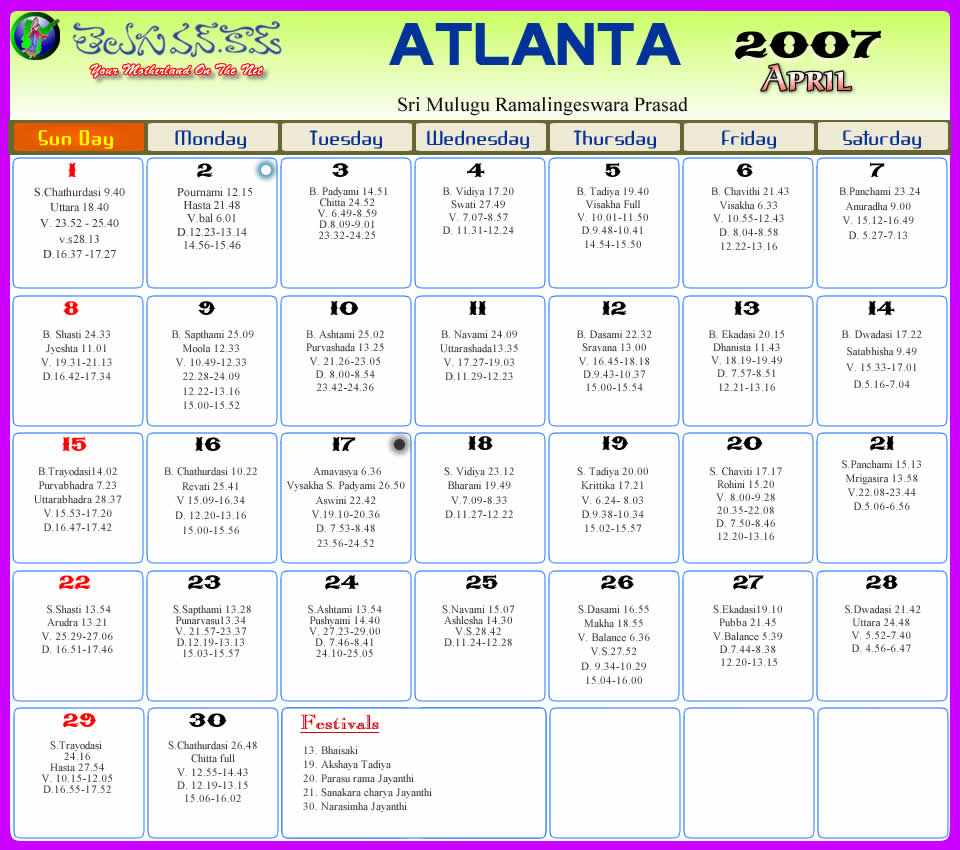 Atlanta Telugu 2007 Calendar