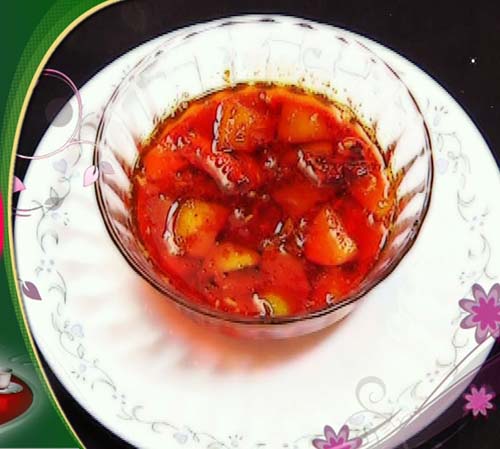 స్టౌ మీద కడాయి పెట్టి నూనె వేయాలి. వేడెక్కాక మామిడి ముక్కలు వేసి వేయించాలి. కొద్దిగా రంగు మారిన తీసేయాలి. అదే నూనెలో ఎండు మిర్చి కూడా వేసి వేయించాలి. వేగాక బెల్లం వేయాలి. బెల్లం కరిగిన పాకం పడుతున్నప్పుడు చక్కెర కూడా వేసెయ్యాలి. రెండూ చిక్కని పాకంలాగా అయ్యాక మామిడి ముక్కలు వేసి బాగా కలపాలి. పాకం ముక్కలకు బాగా అంటి, చూడటానికి హల్వాలాగా తయారవుతుండగా ఆవాలు, మెంతుల పొడిని వేసి మరి కాసేపు ఉడికించాలి. మిశ్రమం బాగా దగ్గర పడిన తర్వాత దించేసుకోవాలి. దీన్నిఓ పళ్లెంలో పలుచగా పరిచి మూడు నాలుగు రోజుల పాటు ఎండలో పెట్టాలి. ఆ తరువాత సీసాలో కానీ జాడీలో కానీ వేసి భద్రపరచాలి.