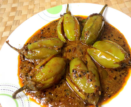 తరువాత అడుగు మందం ఉండే గిన్నెలో కొద్దిగా నూనె వేసి వంకాయలను ఒకదానిపక్కన ఒకటి అమర్చి, మూతపెట్టి, సన్నటి మంటమీద మగ్గనిచ్చి దించేయాలి.