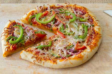ఒక గిన్నెలో మైదా తీసుకుని అందులో ఈస్ట్,వంటసోడా వేసి గోరువెచ్చటి నీటితో చపాతి పిండిలా కలుపుకుని 15 నిమిషాలు పక్కన ఉంచాలి. ఇప్పుడు స్టవ్ వెలిగించుకుని కడాయిలో నూనె వేసి ముందుగా సన్నగా తరిగి ఉంచుకున్న క్యాప్సికం ముక్కలు, టమాటా ముక్కలు వేసి దోరగా వేయించి పక్కన పెట్టుకోవాలి. నానిన పిండిని మరొకసారి బాగా మెదిపి, అర అంగుళం మందంలో గుండ్రంగా చపాతీలాగా చేతితో వత్తుకోవాలి. ఇప్పుడు పిజ్జా బేస్ తయారయ్యిందన్నమాట.ఇలా చేసిపెట్టుకున్న పిజ్జా బేస్ ని స్టవ్ మీద ప్యాన్ సిమ్ లో పెట్టి ఆ ప్యాన్ కి కొద్దిగా వెన్నరాసి దీనిని మూతపెట్టాలి. ఒక 5 నిమిషాలు అయ్యేసరికి పిజ్జా బేస్ మందంగా ఉబ్బుతుంది. ఇప్పుడు వేయించి పక్కన పెట్టుకున్న టమాటా మరియు క్యాప్సికం ముక్కల మిశ్రమాన్ని బేస్ పైన వేసి, టమాటా సాస్, వెన్న, పన్నీరు తురుము వేసి మరికొద్దిసేపు ఉంచాలి. 10 నిముషాలు అయ్యాక ముక్కలుగా కోసుకొని హాయిగా తినచ్చు. అంతే పిల్లలు, పెద్దలు ఎంతో ఇష్టపడే వేడివేడి రుచికరమైన పిజ్జా ఇంట్లోనే తయారుచేసుకోవచ్చు.