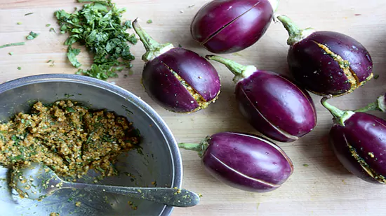 * Use a teaspoon to stuff each eggplant with about 1/8 of the filling. Gently pry open the eggplant, stuff in the filling. Make sure there is filling between each of the cuts. Gently squeeze the eggplant to make the filling sticks and fills the crevices. * Pour the oil into a large nonstick skillet over medium heat to film the bottom. When hot, add the eggplants in a single layer.