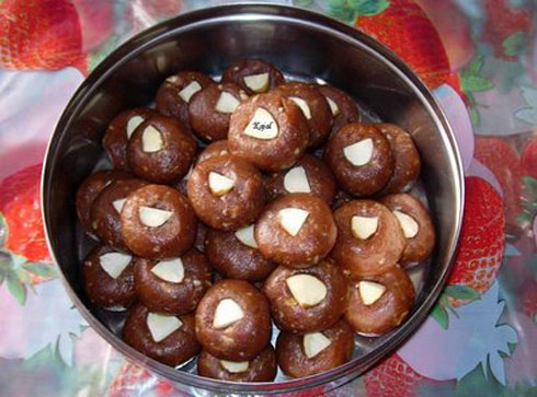 చపాతీల్లా చేసిన ఖర్జూరం పైన పిస్తా గింజలు అన్నివేసేసి బయటకి రాకుండా గట్టిగా వత్తాలి.