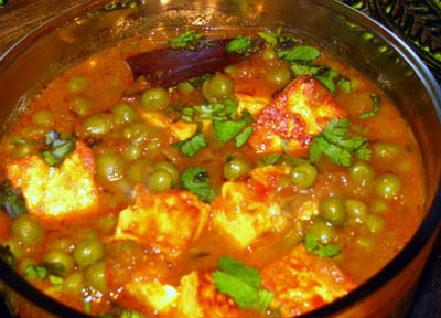 * విడిగా మరో బాణలిలో నూనె వేసి కాగాక జీలకర్ర, పసుపు, దనియాల పొడి వేసి వేయించాలి. ఇప్పుడు ముందుగానే వేయించిన చింతపండు, టొమాటో గుజ్జు మిశ్రమం వేసి కలపాలి. తరువాత క్రీమ్, చెక్కర, ఉప్పు వేసి కలిపి సన్నని మంటమీద వేగనివ్వాలి. తరువాత ఉడికించిన పనీరు ముక్కలు, బఠాణీలు వేసి కలిపి కాసేపు ఉడికించాలి అవసరమైతే కొద్దిగా నీళ్ళు పోసి ఉడికించాలి. చివరగా కొత్తిమీర తురుము, వెన్న వేసి దించాలి.