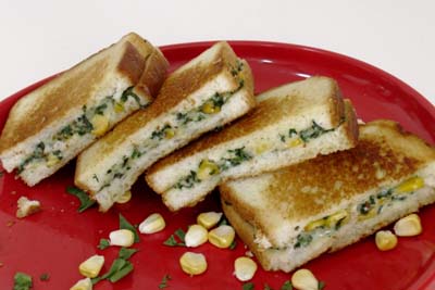 To make the white sauce, in a pan add butter then add 2 tbsp maida mix properly and add 1/2 cup milk and salt as per taste. To this add grated cheese and mix well. Now keep this white sauce aside. To make the filing for the sandwich, first in a pan add butter and add corn. Sauté it for 2 to 3 mins, to this add spinach and sauté for 3 more minutes. Now add salt, red chilli powder, black pepper powder and mix well and switch off the flame. Now add coriander leaves and white sauce and mix well. Now the filling in ready. Now take a slice of bread and apply butter and then put the mixture on it. Now cover it with another bread. And toast it or you could put it on a pan and remove it when both the sides of the sandwich turn golden brown. Serve it with tomato ketchup.
