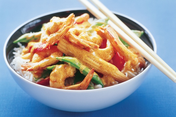 * Add the remaining oil to the wok along with the prawns and curry paste. Stir-fry for 2 minutes. Add the coconut milk. Simmer for 5 minutes or until slightly thickened.