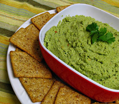 In a skillet over medium heat, roast garlic cloves until light brown and peel off the skin once cool. Chop the garlic cloves coarsely in a food processor. Add cooked edamame beans, cayenne pepper, cumin powder, salt and black pepper and grind. Add olive oil, lime juice and half of the chopped cilantro and just pulse once to combine. Add the water in which we cooked beans to the mixture, a little at a time until the mixture is smooth. Garnish with the rest of cilantro leaves. Our healthy dip is ready. If no chips at home, you can even spread it on Rotis and savor !!