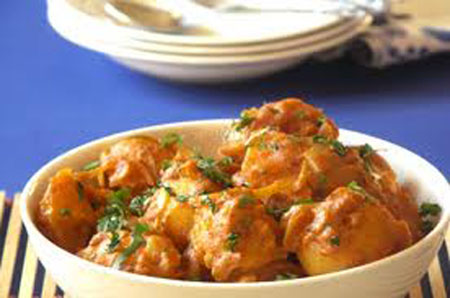 • Carefully arrange the stuffed aloo (potatoes) over the tomato mixture, cover tightly and cook potatoes in their own steam for about 10 minutes until tender.