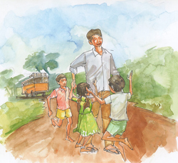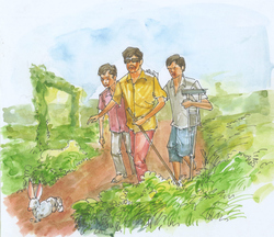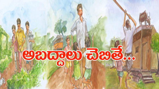"అయితే మరి అబద్ధాలు ఎందుకు చెప్పకూడదో మీకే తెలుస్తుందిలే కాని, ముందు ఎవరెంత బాగా అబద్ధం చెప్పగలరో చూద్దాం- కానీండి" అన్నాడు మామయ్య నవ్వుతూ. "సరే! ఎలాంటి అబద్ధాలు చెప్పాలో మాకు తెలీదుగా, అందుకని ముందు నువ్వే మొదలు పెట్టు!" అన్నారు పిల్లలు. "సరే, అయితే వినండి: ఒక తోటలో ఓ కుంటోడు, ఓ గుడ్డోడు, ఒక మూగోడు నడుస్తూ ఉన్నారు.
