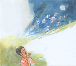 "నేను చెప్పగలను!" అని మొదలు పెట్టాడు గోపి. "ఒక రోజు నేను బడి నుండి వస్తుండగా చాలా పక్షులు -వీపు కిందికి, తల పైకి- పెట్టి ఎగురుతూ కనిపించాయి. నేను చూస్తూండగానే అవి అట్లా పైపైకి ఎగిరి ఎగిరి పోయినై. చివరికి ఆ రోజు రాత్రి చంద్రుడు వచ్చే సరికి అవన్నీ చంద్రుడిని చేరుకున్నాయి. పాపం అంత దూరం ఎగిరి వెళ్ళే సరికి వాటికి కాస్తా చాలా ఆకలి అయ్యింది. అప్పుడు చంద్రుడు వాటికి తేనె పోశాడు. ఆ తేనె కారి నా మీద పడుతుంటే నేను ఏంచేశానో తెలుసుగా, నా స్కూలు పుస్తకంతో పట్టేసుకుని కడుపునిండా తాగాను!" ఆపాడు గోపి. "బలే చెప్పావు గోపీ -ఇప్పుడు చందూ, నువ్వు చెప్తావా?" అడిగాడు మామయ్య చందూని.