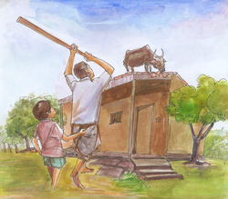 చందూ మొదలు పెట్టాడు: "సరే వినండి - ఒక రోజున బాగా వర్షం కురిసింది. హఠాత్తుగా పైనుండి మా ఇంట్లోకి కూడా వర్షం పడటం మొదలు పెట్టింది! 'ఏంటబ్బా' అనుకొని బయటికి వెళ్ళి చూస్తే ఏముందనుకుంటున్నారు? మా ఇంటి పైన ఒక ఆవు నిల్చొని పెంకులు తినేస్తోంది! అప్పుడు మా నాన్న పైప్ ద్వారా ఆవుని కిందికి తెచ్చి, ఒక మూటలో కట్టి, సంతకి తీసుకెళ్ళి అమ్మేశాడు!" చెప్పాడు చందు. "భలే! నీ అబద్ధం కూడా నాకు నచ్చింది. ఇప్పుడు నీ వంతు, గౌరీ!" అన్నాడు మామయ్య నవ్వుతూ.