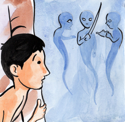 ఇక మూడో దయ్యం అన్నది: "నా దగ్గర ఒక ప్రతిమ ఉంది. ఆ ప్రతిమను పూజించి ఏ వస్తువును కోరుకుంటే దాన్ని ప్రసాదిస్తుందది!" అని. "ఏదీ, చూపించు - చూపించు" అని ముచ్చట పడ్డాయి మొదటి దయ్యాలు రెండూ. మూడోది వాటికి తన దగ్గరున్న ప్రతిమను చూపించింది. "భలే ఉంది, మేమూ తెస్తాం, ఆగు- మేం చెప్పిన వస్తువుల్ని కూడా మాకు అందుబాటులోనే ఉంచుకున్నాం మేము!" అంటూ అవి రెండూ ఎగిరివెళ్ళి, క్షణాల్లో తమ తమ వస్తువులతో తిరిగివచ్చాయి. అన్నీ అట్లా ఆ వస్తువులను చూసుకొని మురిసిపోయాయి. ఇదంతా వింటున్న భరత్కి ఏం చెయ్యాలో తోచలేదు. 'దూరంగా పారిపోదాం' అని ఎంత ప్రయత్నించినా మళ్ళీ అక్కడికే వస్తున్నాడాయెను! అంతలోనే దయ్యాలు మూడూ తొర్రలోంచి బయటికి వచ్చి, ఏవో కబుర్లు చెప్పుకుంటూ భరత్ను గమనించకనే ఎటో ఎగిరిపోయాయి.