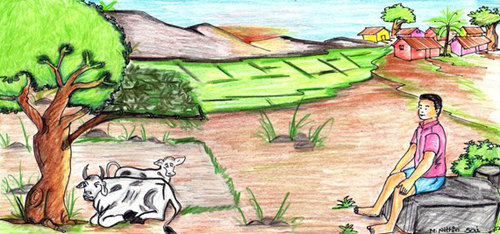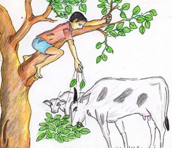 రెండు మూడు రోజులుగా అతనికి అక్కడ ఒక ఆవు, దూడ కనిపిస్తున్నాయి. రెండూ పడుకొనే ఉంటున్నాయి- పెద్దగా కదలట్లేదు, మెదలట్లేదు. బాగా సన్నగా ఉన్నాయి. రాముకి వాటిని చూస్తే జాలివేసింది. "అయ్యో! వీటికి మేత ఉన్నట్లు లేదు. ఎక్కడా గడ్డి కూడా లేదు. పాపం" అనిపించింది. దగ్గర్లోనే ఉన్న చెట్టు నొకదాన్ని ఎక్కి, కొన్ని కొన్నిగా ఆకులు తుంచి వాటికి అందించాడు. తరువాతి రోజున రాము వచ్చేసరికి ఆవు-దూడ రెండూ అక్కడే కూర్చొని ఉన్నాయి.