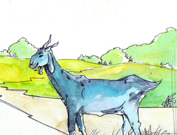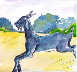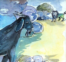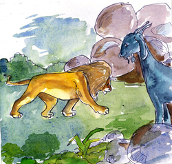 అంతకు ముందు ఎన్నడూ సింహం అలాంటి జీవిని చూసి ఉండలేదు: పెద్ద గడ్డం,వాడిగా ఉన్న కొమ్ములూ, చూసేందుకు చిన్నగానే ఉన్నా, బలిష్ఠంగా వంపులు తిరిగి ఉన్న శరీరం! ఆ వింత జంతువును చూడగానే సింహానికి భయం వేసింది. గుహలోంచి బయటికి పరుగెత్తి, గుహద్వారం ముందు అటూ ఇటూ తిరుగుతూ పచార్లు చేయటం మొదలెట్టిందది.