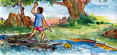 మించలవారికోట గ్రామానికి చివరలో ఒక చెరువు ఉండేది. చెరువు గట్టున గణేష్ వాళ్ళు రోజూ ఆడుకుంటూ ఉండేవాళ్ళు. ఒకరోజున వాడు బంతినొకదాన్ని తీసుకొని వెళ్ళాడు అక్కడికి. ఆ సమయానికి మిగిలిన పిల్లలెవ్వరూ రాలేదు ఇంకా. వాడొక్కడే అలా బంతితో ఆడుతుంటే, అది కాస్తా వెళ్ళి చెరువులో ఎక్కడో పడిపోయింది.