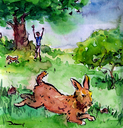 "నీ మాటలు నాకు అస్సలు అర్థంకావటం లేదు. కొంచెం వీడి కాలును వదిలి మాట్లాడు" అంది కుందేలు.