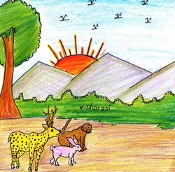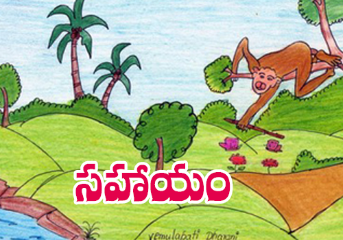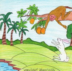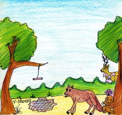 అటువైపుగానే కాస్త దూరాన తలవంచుకొని పోతున్నాయి కుందేలు, దాని మిత్రుడు జింకా. అవి చూసాయి, తోడేలు కోతిని ఎత్తుకుపోవడం. రెండూ'కోతిని కాపాడాలి. ఎలాగ?'అని ఒక ఉపాయం ఆలోచించాయి. గబగబా వెళ్ళి, తోడేలు వస్తున్న దారిలో ఓ చెట్టుకు మాంసం ముక్కను వ్రేలాడదీసాయి. ఆ మాంసం ముక్కని అందుకోవాలంటే తోడేలు బాగా పైకి ఎగరాలి. కోతిని లాక్కొస్తున్న తోడేలుకు చెట్టునుండి వ్రేలాడుతున్న మాంసం ముక్క కనపడగానే నోరూరింది.