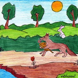 అయితే ఆ చెట్టు క్రింద ఉన్నది పెద్ద గుంత! కుందేలు, జింక ఆ గుంత కనబడకుండా దానిమీద ఆకులు, చెత్తా కప్పి ఉంచాయి! మాంసం ముక్కకోసం ఎగిరిన తోడేలు నేరుగా ఆ గుంతలోకే పడిపోయింది!