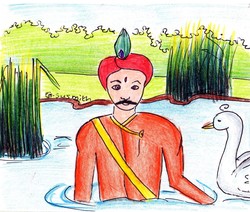 అనగనగా ఓ హంస. ఆ హంస ఒకసారి ఓ చక్కని చెరువులో ఈత కొడుతూ తిరుగుతున్నది, తోటి హంసలతో బాటు. సరిగ్గా ఆ సమయానికే అ దేశపు మహారాజు ఏదో పని మీద వెళుతూ ఉన్నాడు ఆ త్రోవలో. వెళుతూ వెళుతూ దాహం తీర్చుకోవటంకోసం ఆయన చెరువులోకి దిగాడు. ఆయన్ని చూడగానే హంసలన్నీ ఎగిరిపోయాయి- కానీ మన హంస మాత్రం, పరధ్యానంలో ఉండి రాజు దగ్గరకే ఎగిరి వచ్చి, ఆయన చేతచిక్కింది.