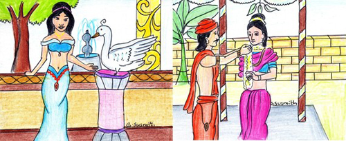 "అమ్మాయీ! నేను బ్రహ్మవాహనమైన హంసల కుటుంబానికి చెందిన దాన్ని. నేను మాట్లాడే చమత్కారమైన మాటలు వినటం దేవతలకు కూడా సాధ్యంకాదు" అని దీని అర్థం. అట్లా తన పాండిత్యంతోటి ఆమెను మెప్పిస్తూ, మెల్లగా మాటలు కలిపింది; తను మాట యిచ్చిన మహారాజు రూప లావణ్యాల గురించి, శౌర్య ప్రతాపాల గురించి చెప్పింది; ఇలా చక్కటి దూతగా తన పని చేసింది. ఆపైన ఆ మహారాజు, వీళ్ల రాజ్యానికి రావటం, స్వయంవరంలో పాల్గొని యువరాణిని పెళ్ళాడటం జరిగిపోయింది!