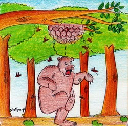 మళ్ళీ చెట్టెక్కుతుంది. మన తేనెపట్టును పట్టుకొని, దాన్ని పిండి తినేసేటట్లుంది!’ అనుకొని, దాని మీదికి దూకి కుట్టసాగాయి. అది గమనించిన ఎలుగుబంటి చేతికందిన రాళ్ళను, ఆకుల్ని, చెత్తను, చెట్టుకొమ్మల్ని వాటి మీదకు విసిరేస్తూ గంతులు వేసింది. తేనెటీగలేమో వాటినుండి తప్పించుకొని దూరంగా ఎగురుతూ, మళ్ళీ తిరిగి వచ్చి దాన్ని కుడుతూ పోయాయి. కొద్ది సేపటికి ఎలుగుబంటేమో తేనెటీగల్నుంచి తప్పించుకొని పారిపోయింది.