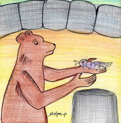 కానీ ’బుల్లి’ అనే తేనెటీగకు ఎలుగుబంటి వేసిన రాయి తగిలింది పాపం. దాని రెక్క కాస్తా విరిగి వేలాడసాగింది. అది నేలమీద పడిపోయింది. తేనెటీగలన్నీ దాన్ని చూసాయి కానీ, ఏమీ చెయ్యలేక ఊరుకున్నాయి. అయితే కొద్ది సేపటికి తిరిగి వచ్చింది ఎలుగుబంటి! అది వచ్చీ రాగానే అటూ ఇటూ చూసి, బుల్లిని తీసుకెళ్ళి తన గుహలో ఒకచోట పెట్టింది. దానికి రోజూ ఆహారం పెట్టింది. ఏవో ఆకుల్ని తెచ్చి పిండేది దాని రెక్కమీద. అట్లా కొన్ని రోజులు గడిచే సరికి బుల్లి రెక్క అతుక్కున్నది! అది ఎగరగలిగే స్థితికి రాగానే ఎలుగుబంటి దాన్ని విడిచిపెట్టింది.