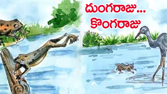ఇలా మొద్దులాగా పడి ఉండే రాజు బాలేదు" అన్నై కప్పలు. "సరే, అయితే!మీకు కావలసింది ఇదిగో- ఇలాంటి రాజే!" అని దేవుడు ఒక కొంగని చెరువులోకి వదిలాడు. ఈ కొంగరాజు చురుకుగా కప్పలమీద పడి ఒక్కొక్క కప్పనే తినటం మొదలు పెట్టాడు. చూస్తూండగానే చెరువులోని కప్పలన్నీ తరిగిపోయాయి. మిగిలిన కప్పలన్నీ చాలా దు:ఖించాయి- 'చక్కని దుంగరాజుని ఇస్తే ఎంచక్కా సంతోషించక, ఇట్లాంటి రాజుని కొని తెచ్చుకున్నామేమి?' అని .