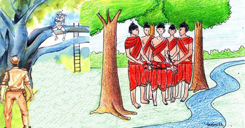 అనగా అనగా ఒక ఊళ్ళో ఐదుగురు మాంత్రికులు ఉండేవాళ్ళు. ఒక రోజున ఆ ఐదుగురు మాంత్రికులూ వేరే ఊరికి బయలు దేరారు. అట్లా పోతూ ఉంటే, వేగంగా పారే నది ఒకటి అడ్డు వచ్చింది వాళ్ళకు. నదికి వరద వచ్చి ఉన్నది. ఎటు చూసినా అలవికానన్ని నీళ్ళు! దాటేదెలాగ?