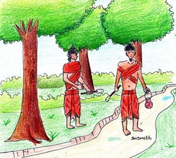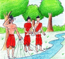 మొదట ఒకడు నదిని మొత్తాన్నీ ఒక సీసాలో బంధించేసాడు. ఇసకలో నడుచుకుంటూ అవతలి ఒడ్డుకు చేరుకున్నాడు. ఆ తర్వాత సీసా మూత తీసి, నదిని వదిలేశాడు. రెండవ వాడు నవ్వాడు. తన చెప్పుల్ని తీసి ముందు పెట్టుకున్నాడు. ఏవేవో మంత్రాలు చదివాడు. తర్వాత ఆ చెప్పులు వేసుకొని,నీళ్ళమీదనుండి మామూలుగా నడుచు-కుంటూ పోయాడు!