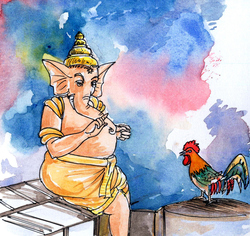 వినాయకుడు దాన్ని చూసి "ఓ కోడిపుంజూ! ఒక సారి ఇలా రా!" అని పిలవగానే , 'నన్ను పేరు పెట్టి పిలుస్తున్నారు ఎవరా?'అని దగ్గగకొచ్చింది కోడిపుంజు. చూడగా, అక్కడ అరుగు మీద వినాయకుడు కూర్చొని ఉన్నాడు! దాంతో అది సంతోషంతో ఉబ్బి తబ్బిబ్బైపోతూ గభాల్న దగ్గరికి వచ్చి, రెక్కలు మడిచి నమస్కరిస్తూ "చెప్పండి స్వామీ! కులాసానా? నన్ను పిలిచా-రెందుకూ?" అని అడిగింది.