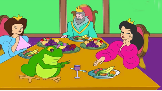 "ఏమయింది, తల్లీ?" అని అడిగాడు రాజు. జరిగిన విషయం తండ్రితో వివరించి చెప్పింది యువరాణి."ఎలాంటి పరిస్ధితిలో నైనా ఇచ్చిన మాటను నిలబెట్టుకోవాలి. కప్పను ఇంట్లోకి రానివ్వు" అన్నాడు రాజు.యువరాణి తలుపు తెరవగానే, కప్ప నేరుగా భోజనాల బల్ల దగ్గరకు వెళ్లి, కుర్చీ పైకి ఎక్కింది. "నన్ను పైకి తీసుకో. నేను నీ బంగారు పళ్లెంలో భుజించాలి" అని యువరాణితో అంది కప్ప. యువరాణి బంగారు పళ్లెం చేత్తో పట్టుకుని, కప్పను ముట్టుకోగానే, అది ఒక అందమైన అబ్బాయిలా మారిపోయింది.