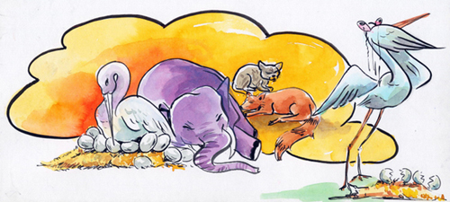 "సరే" అని కొంగ వెనుక ఏనుగు పడుకున్నది.