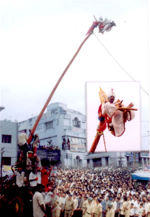 Pujari will go in search of sirimanu and will cut the sirimanu with performing puja etc. That sirimanu can be located any where. The owner must agree to cut his tree for Utsav. That tree will be shaped neatly in to Sirimanu and will be placed over the chariot. This sirimanu will be brought to 3 Lanters junction around 2 PM in the afternoon. At around temple Pujari will make darshan of Goddess and will sit on the Sirimanu chariot.
