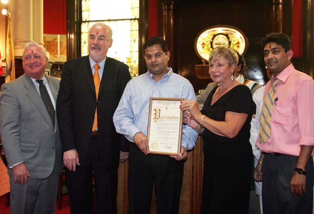 | Mohammed Jaffer Editor SnapsIndia being honored by the City of Jersey City for his contribution and Services to the Indian American Community on the occation of India's 60th Independence Day on Aug15th-07 left to right Councilman Bill Gaughnan, Peter Brennan Councilman at Large , Deputy Mayor Leona Beldini and Dr.Jayesh patel can be seen in pic 07 |