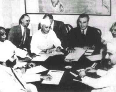 Nehru, left, Vallabhbhai Patel, right, Mahatma Gandhi, center, and other leaders of the Indian National Congress after a meeting in early 1947. (Photo: Courtesy, ‘Nehru: A Pictorial Biography,’ by Michael Edwards, Asia Publishing House, 1962