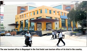 Picture this: 84 hotel rooms of VIP standards in four floors, a swimming pool, a recreation centre and three floors of commercial activities under one roof. This is not a description of a new mall or boutique hotel coming up in the city; these are a few components of the new state tourism office at Begumpet. The building is complete and is only awaiting the official ribbon cutting ceremony, but the date for that has not been set. When it opens, the new tourism office aspires to |